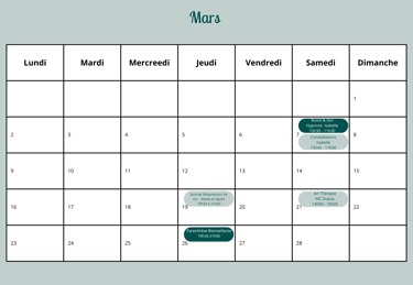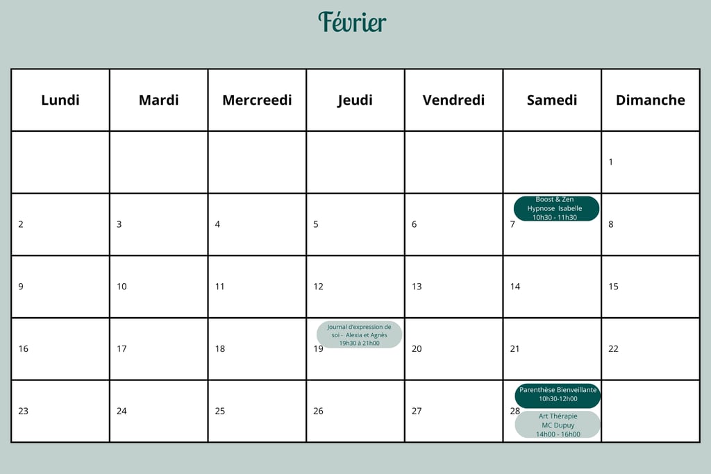 Un atelier par mois soit un samedi de 10h30 à 12h00 puis le mois suivant, un jeudi de 19h30 à 21h00