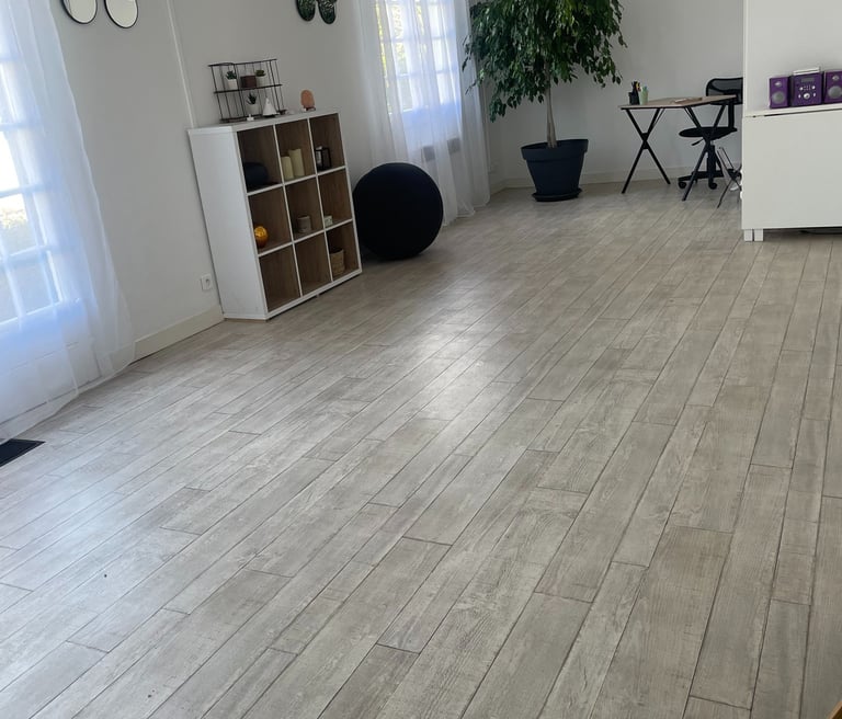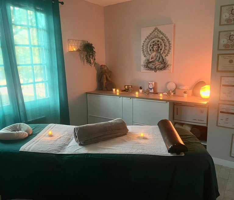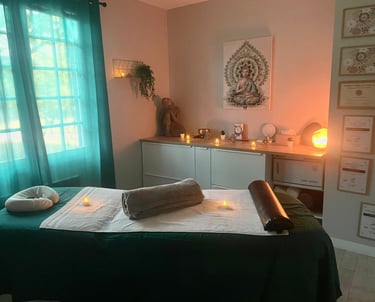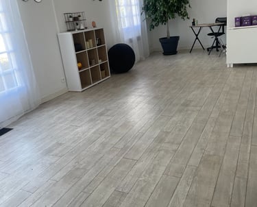 La salle Sophia est un espace intimiste, pensé pour accueillir des séances en individuel ou en duo, dans un cadre chaleureux et confidentiel.