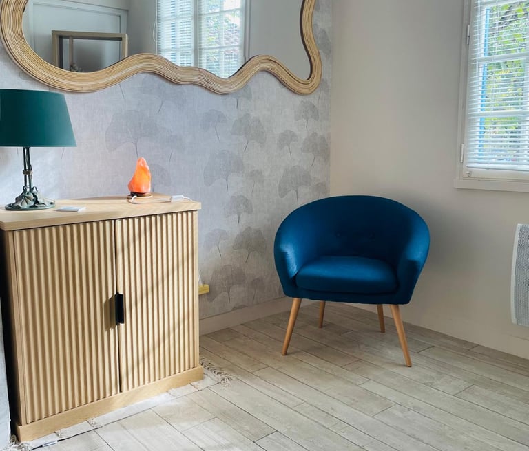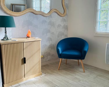 Elle est aménagée avec un bureau discret, deux fauteuils confortables, et une décoration douce qui invite au calme et à l’écoute. C’est le lieu idéal pour les entretiens thérapeutiques, les consultations en cabinet ou les accompagnements émotionnels.