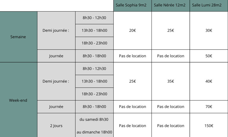 Demi journée semaine : 8h30-12h30 ou 13h30-18h00 ou 18h30-23h00: 20€